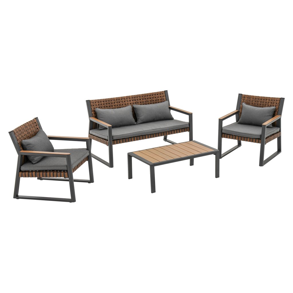 Modern country style coffee furniture set with natural character. Weaves imitating leather combined with an aluminum frame create solid and beautiful furniture for the discerning. Comfortable seats...